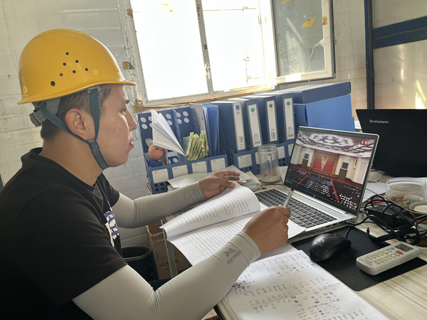 (7月5日,新疆分公司吾悦广场项目一名团员认真学习团的十九大精神)