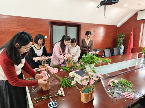 天津分公司组织6名女职工开展了插花活动,在花艺老师的指导下,女职工发挥创意,把多种花材进行修剪,有层次地搭配在一起,制作出一个个充满艺术感的花篮。