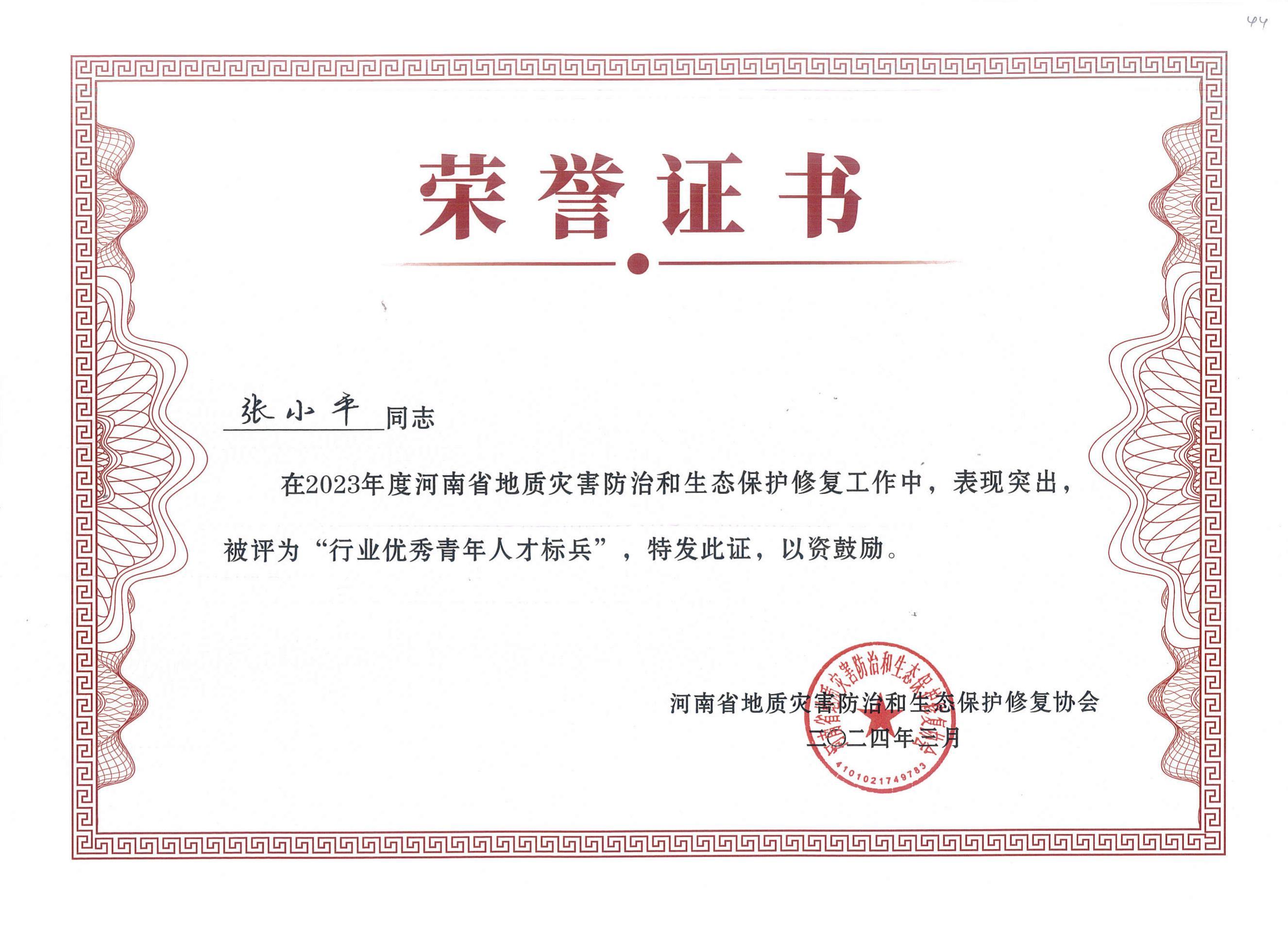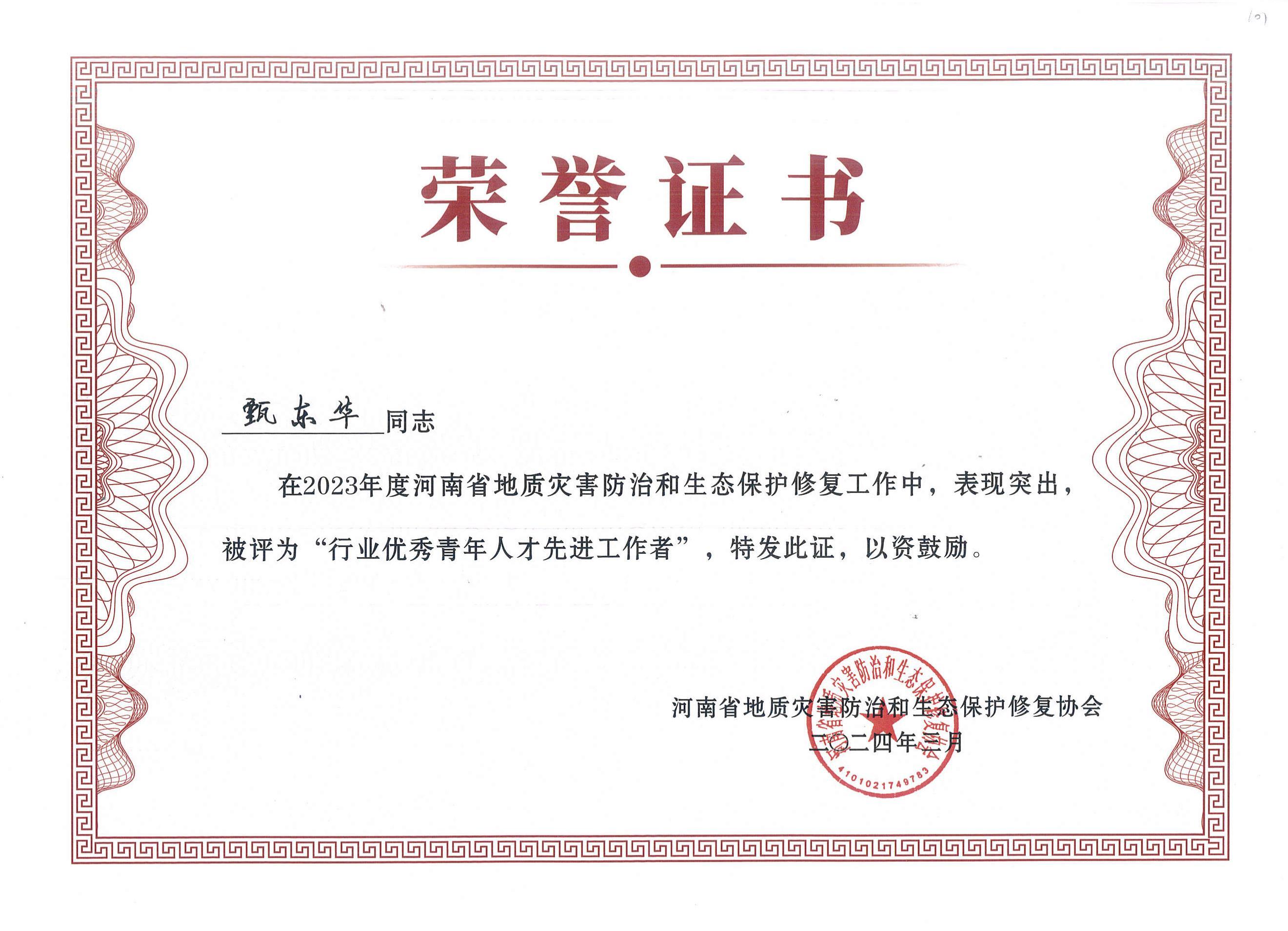 张小平获2023年度“河南省地质灾害防治和生态保护修复行业标兵”称号,甄东华获2023年度“河南省地质灾害防治和生态保护修复行业先进工作者”称号。